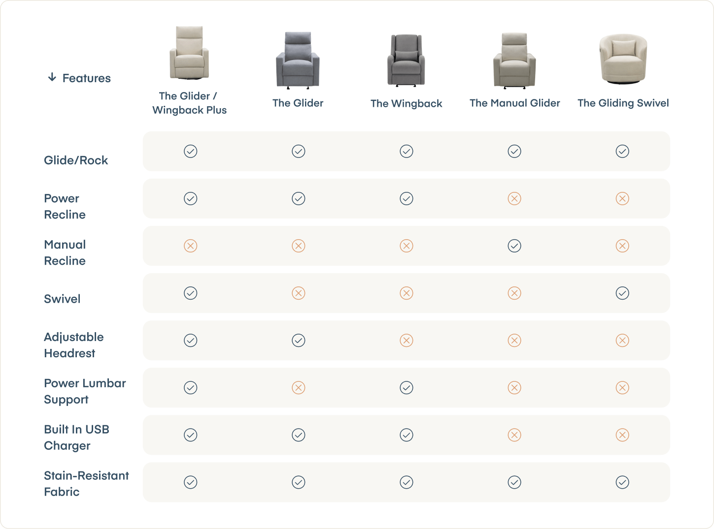 A beloved classic, The Manual Glider features a manual recliner and glide functionality, a wide and comfy seat and our signature spill-proof fabric. The perfect solution for anyone looking for a power-free nursery glider.