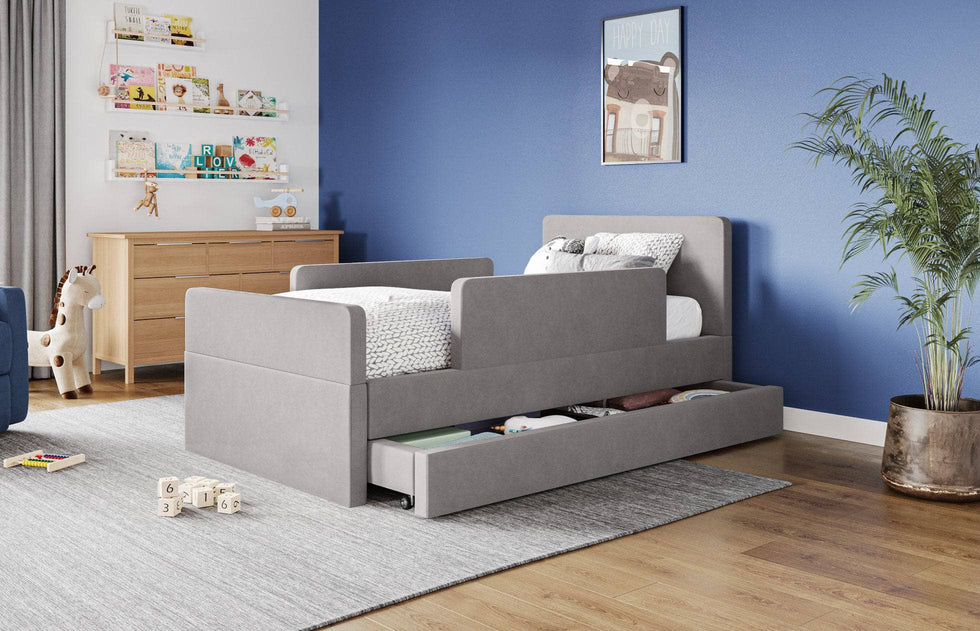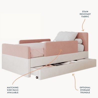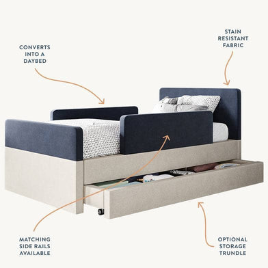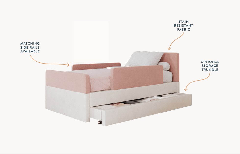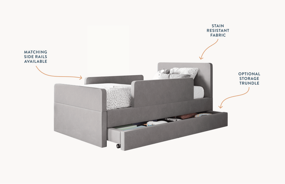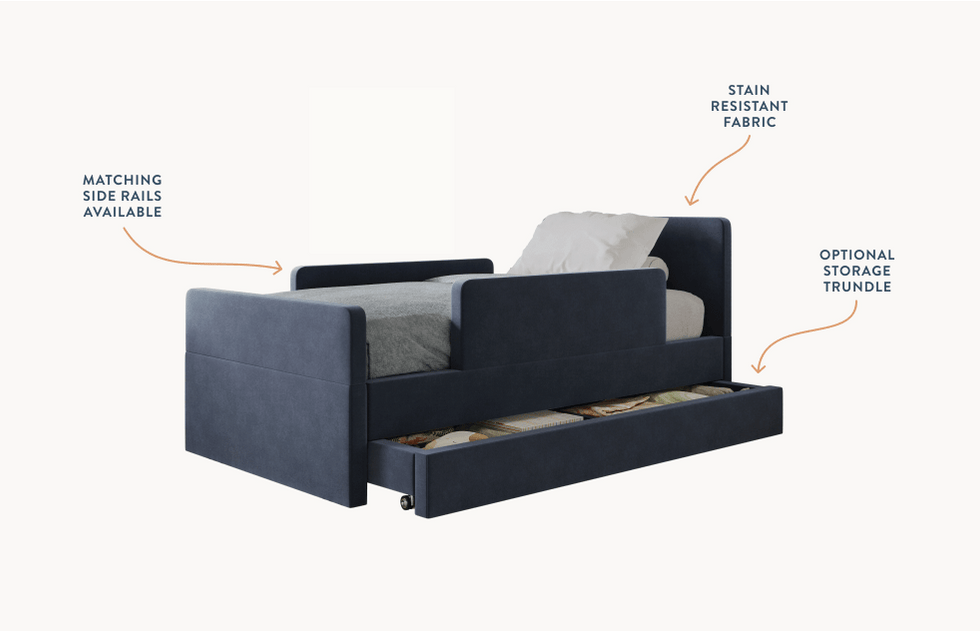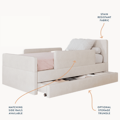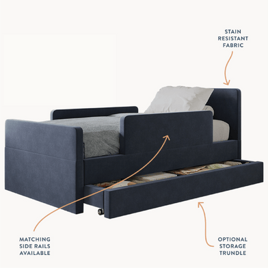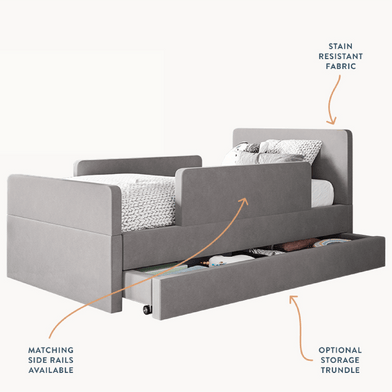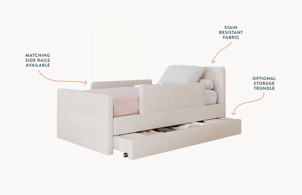 The bed features rounded corners in our signature stain-resistant fabric to keep your little one safe and cozy, and our matching add-ons allow this bed to grow with your family be it by adding safety guard rails or a storage trundle.
