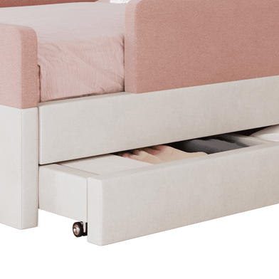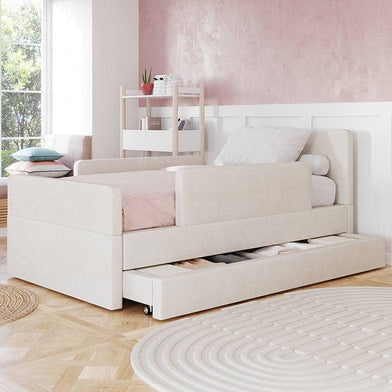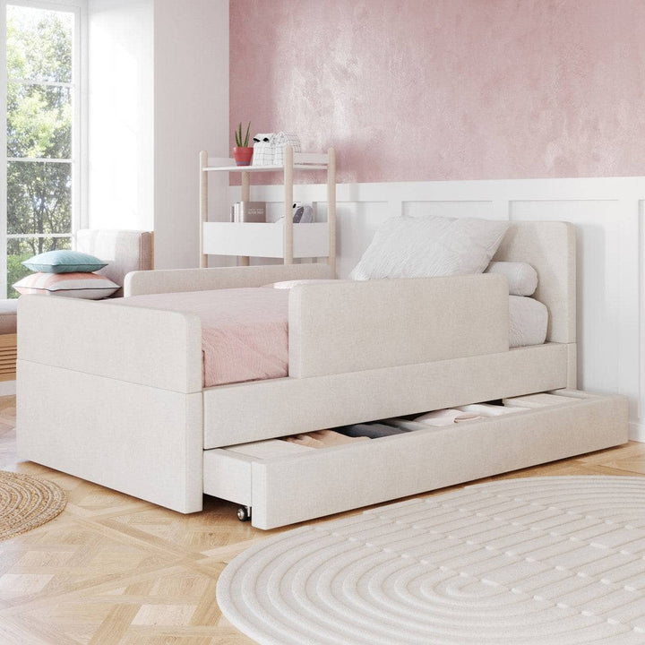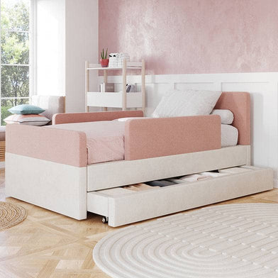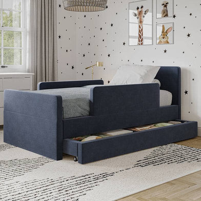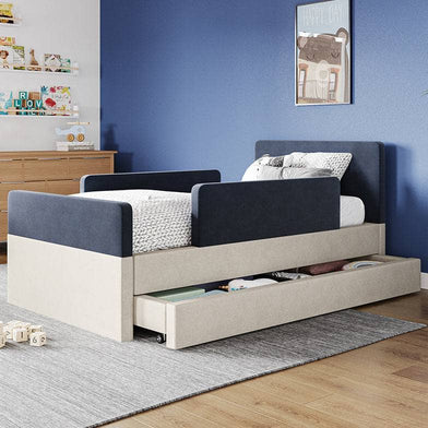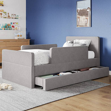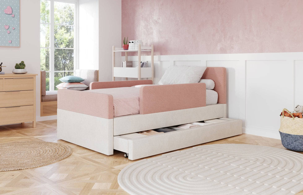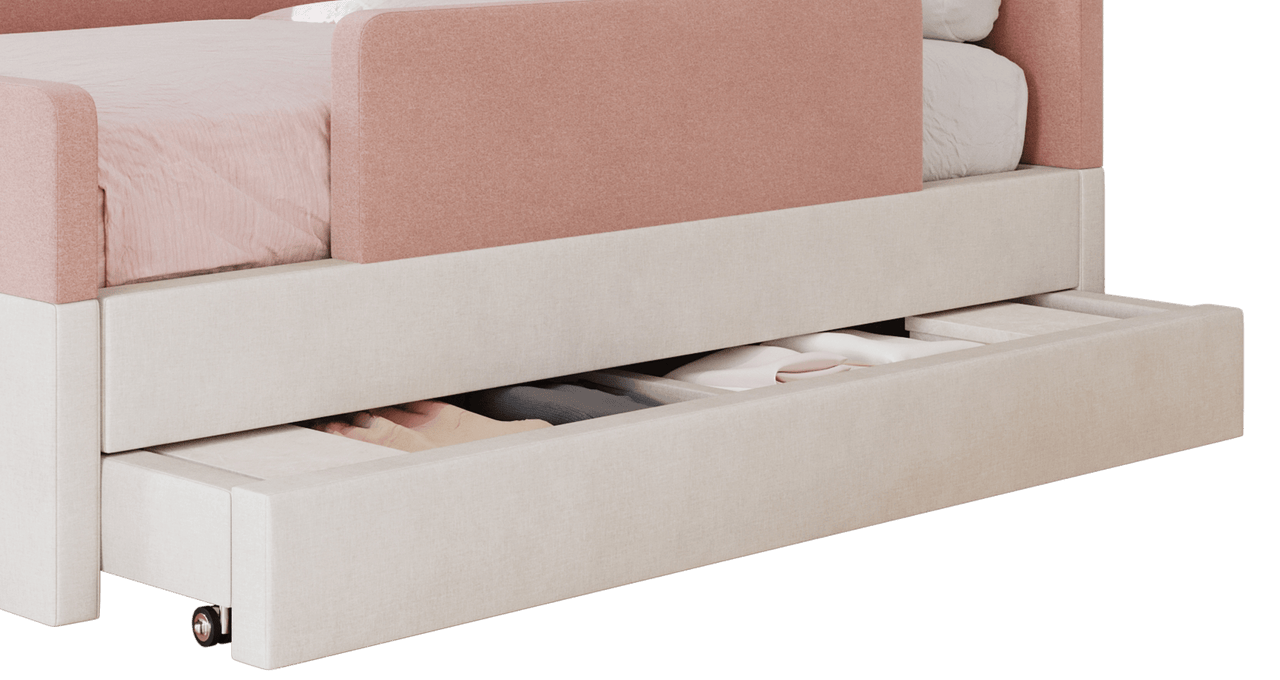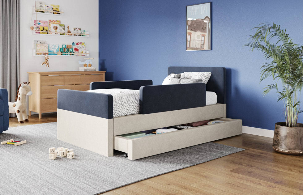 The bed features rounded corners in our signature stain-resistant fabric to keep your little one safe and cozy, and our matching add-ons allow this bed to grow with your family be it by adding safety guard rails or a storage trundle.