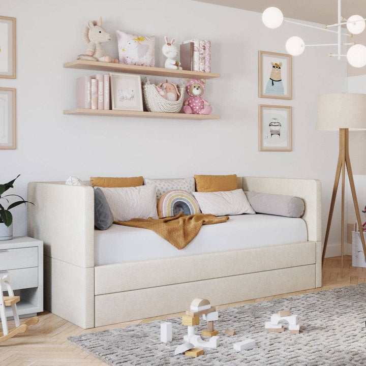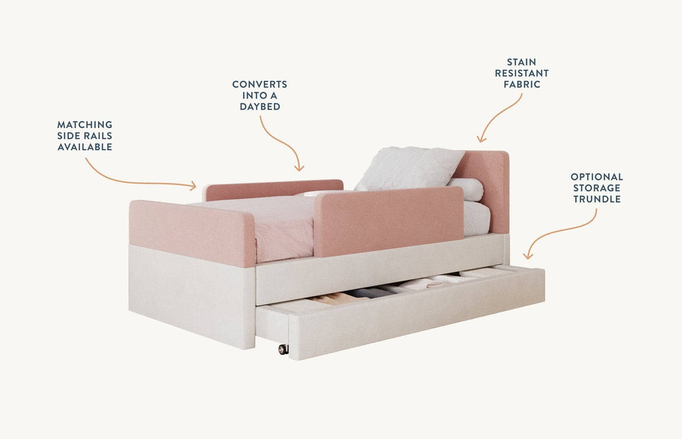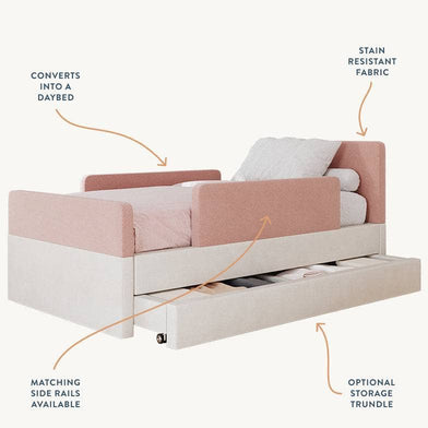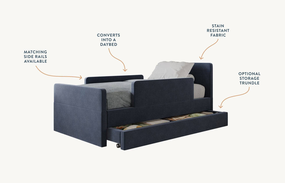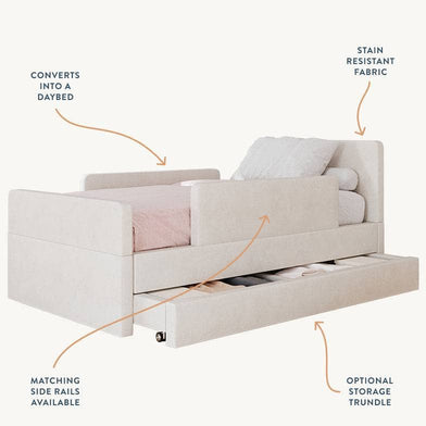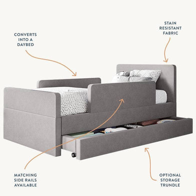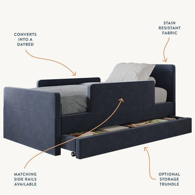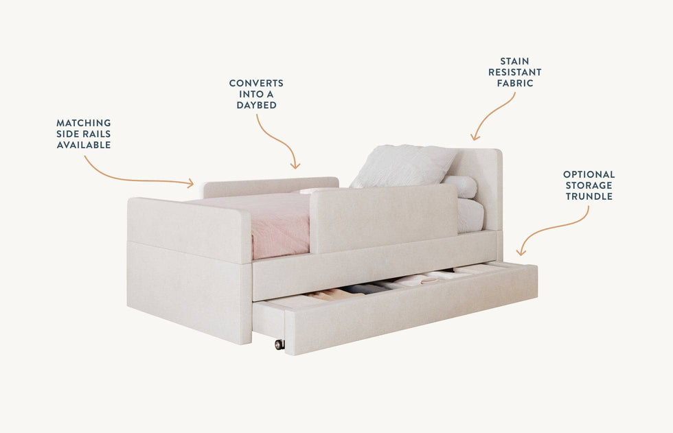 The bed features rounded corners in our signature stain-resistant fabric to keep your little one safe and cozy, and our matching add-ons allow this bed to grow with your family be it by adding safety guard rails or a storage trundle.