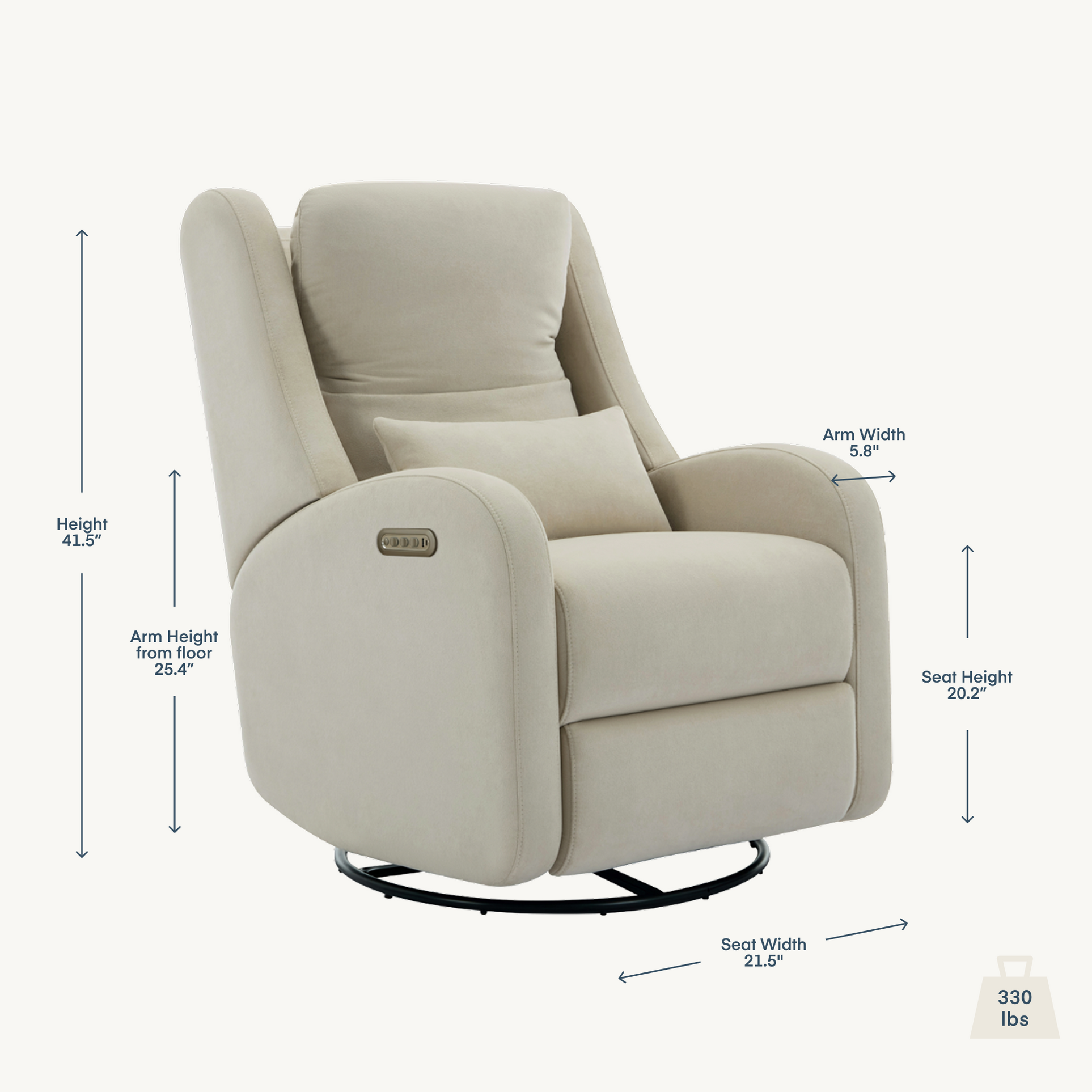 Our most premium glider, now available in a sleek, wingback design. Enjoy a smooth recline and glide, 200° swivel, adjustable headrest, and power lumbar support. Upholstered in soft, stain-resistant fabric for ultimate comfort and durability.